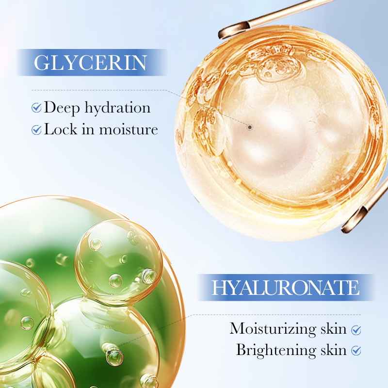 گلیسیرین، هیالورونیک اسید، نیاسینامید، آربوتین، ویتامین E، عصارههای گیاهی